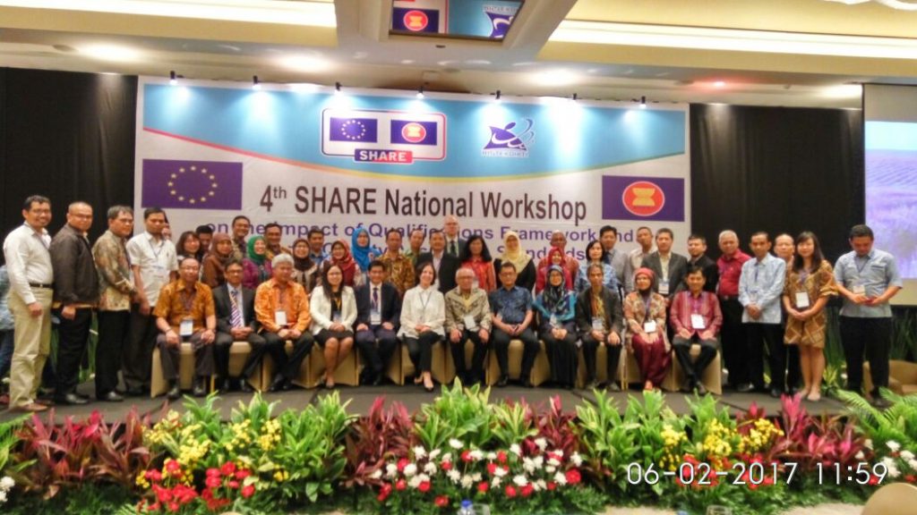JAKARTA – Dalam rangka memperkuat kerja sama regional, meningkatkan mutu dan daya saing, harmonisasi, serta mendukung saling pengertian antara Pendidikan Tinggi Eropa dengan institusi Pendidikan Tinggi di ASEAN, Direktorat Jenderal Pembelajaran dan Kemahasiswaan (Ditjen Belmawa) bekerjasama dengan SHARE menyelenggarakan workshop nasional dengan tema Dampak Kerangka Kualifikasi dan Standar Jaminan Mutu Regional di Perguruan Tinggi Indonesia pada Senin-Rabu (06-07/02). SHARE adalah sebuah konsorsium British Council (lead), Campus France, Jerman Academic Exchange Service (DAAD), Nuffic, Asosiasi Eropa untuk Quality Assurance di Perguruan Tinggi (ENQA) dan Asosiasi Universitas Eropa (EUA).